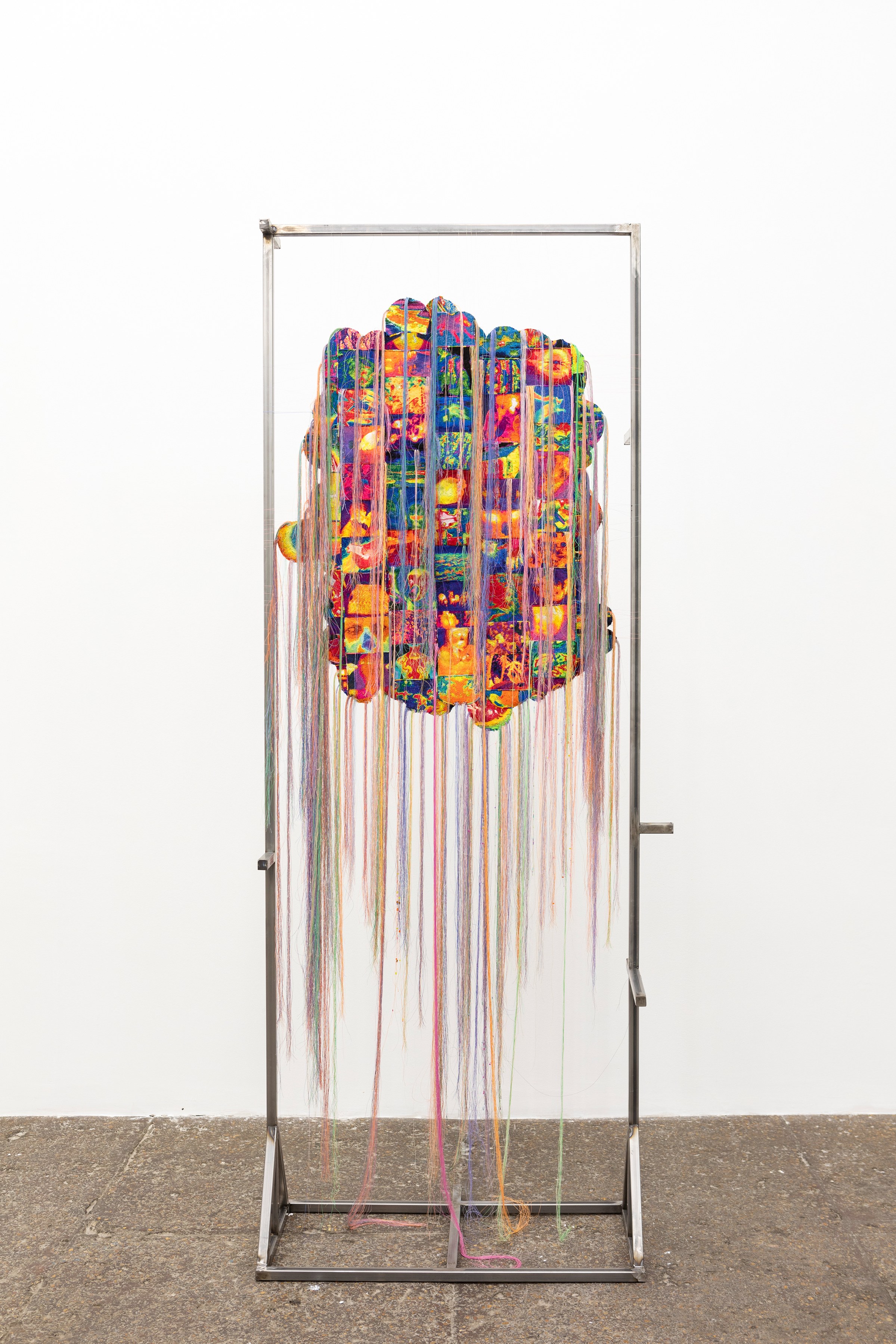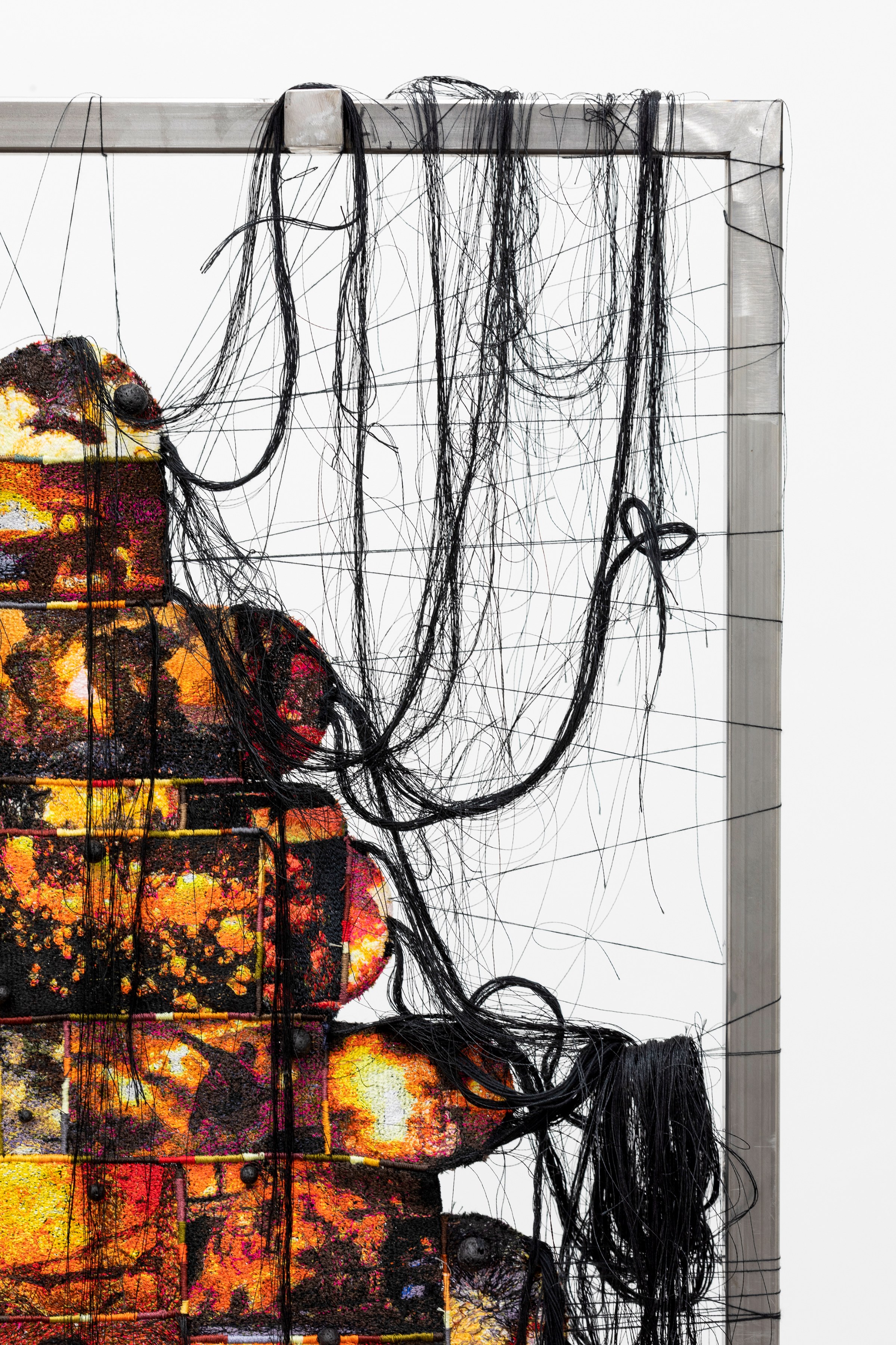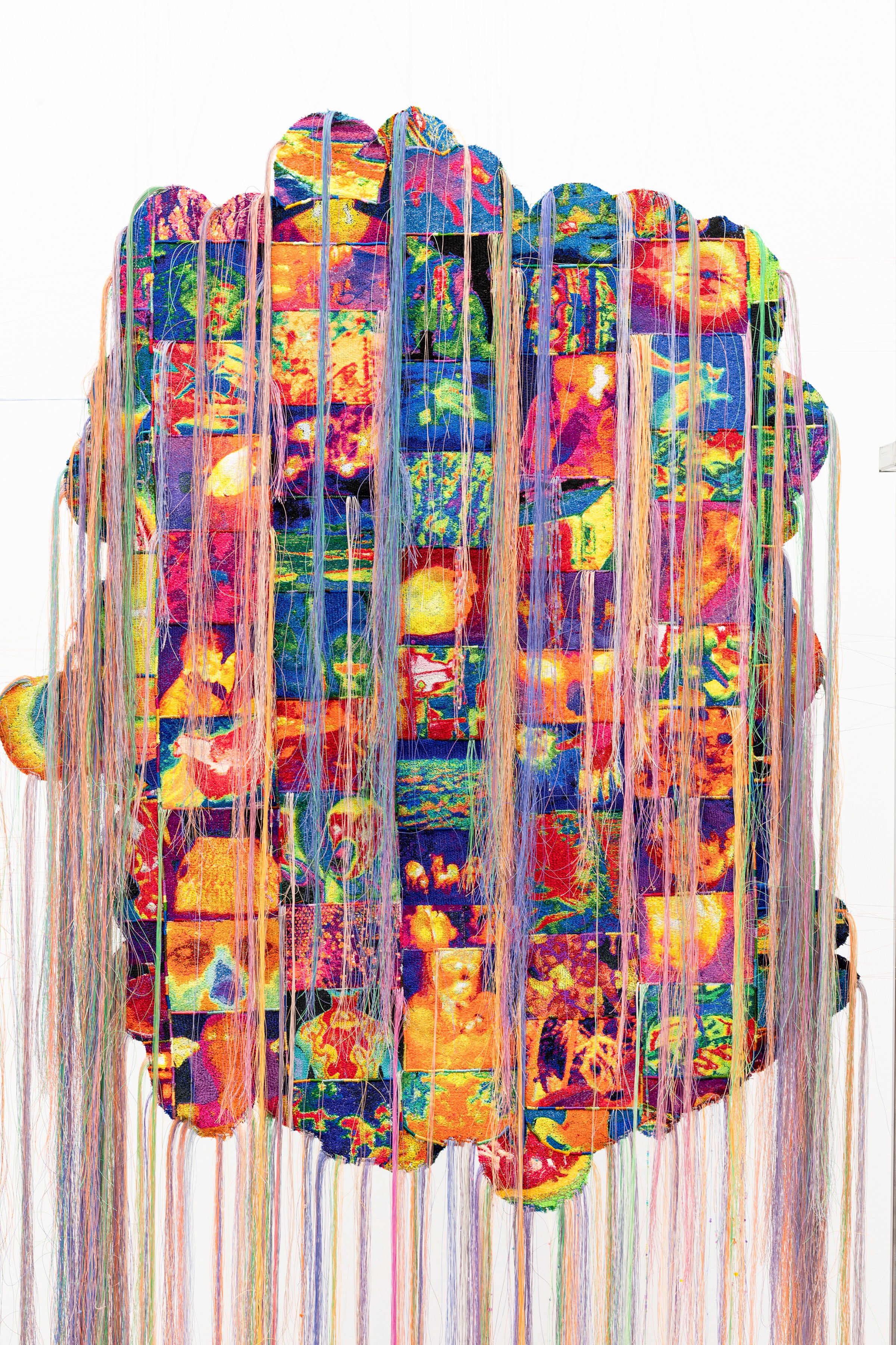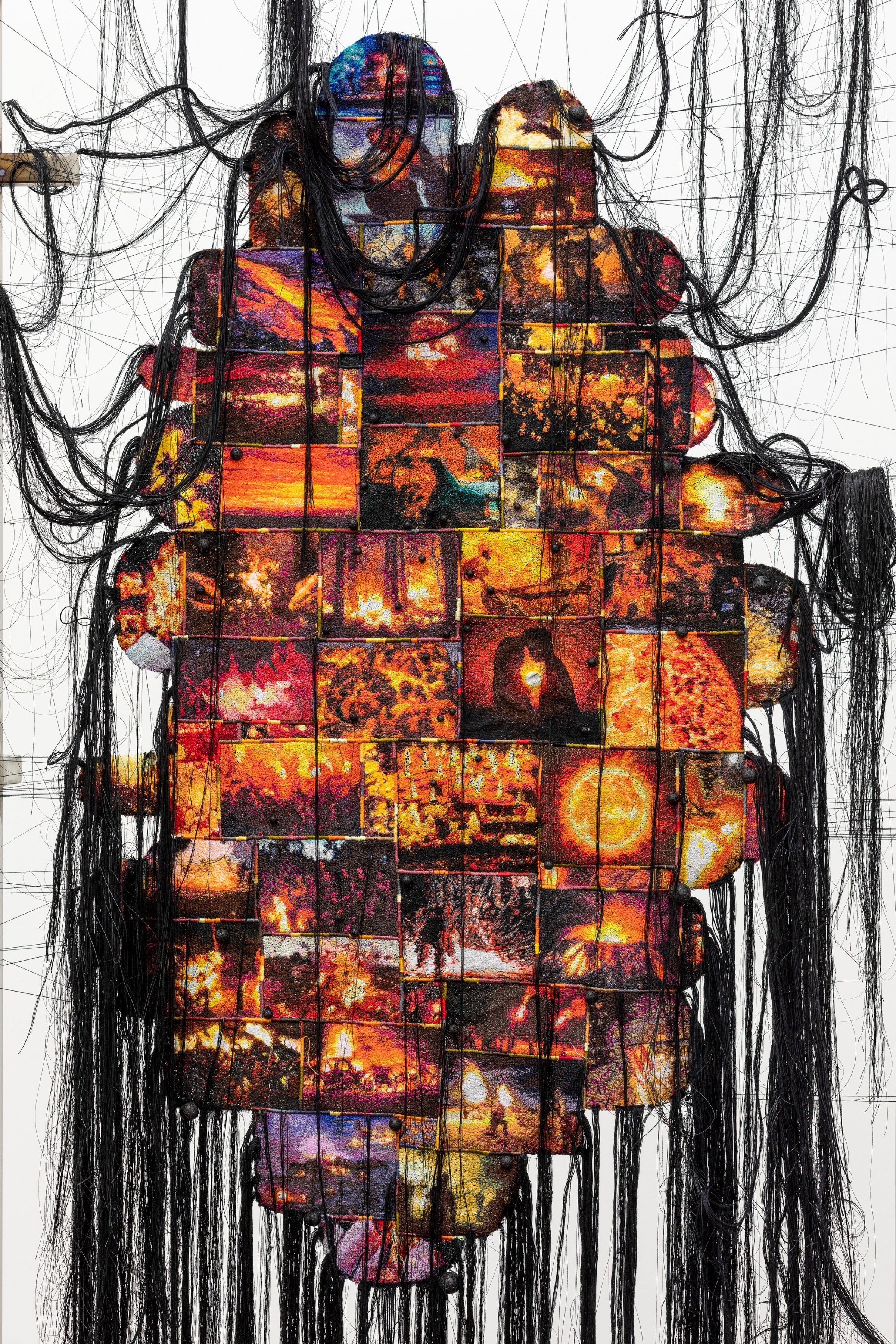Alongside the mixed media filter panels are hanging tapestries made with computerized embroidery machines. The embroidery designs are digitally created by translating found images from thermal cameras as well as images that connote different temperatures through different online search engines. Small embroidery patches are then created and then sewn together carefully to create cumulative textile collages that serve as physical manifestations of the contemporary conception of the different temperature within the context of global pandemic and changing climate.