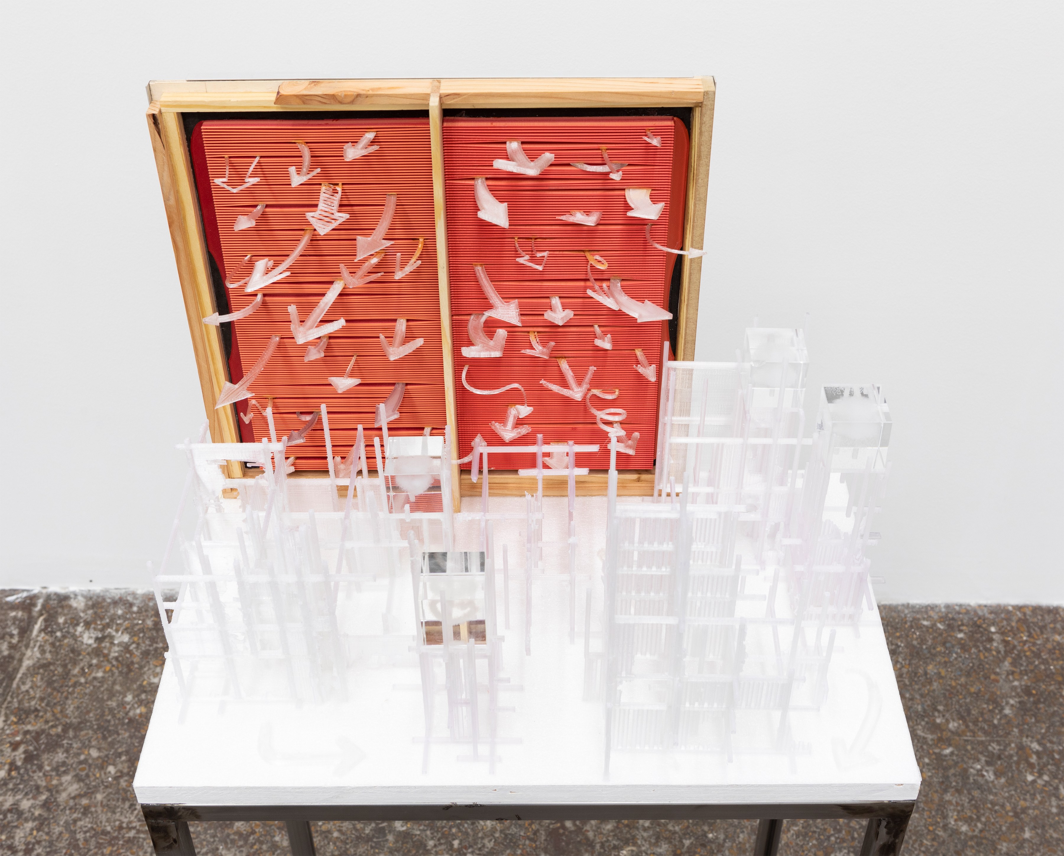 Mimicking and modeling after the aesthetics and structural language of HVAC units, both traditional methods and digital fabrication techniques are utilized to “filter” the found materials and information that Hao Ni encountered at different times and places. In this work, handmade paper, threads and assemblages of found materials from the cities and nature of both East Asia to Central Europe are molded into pleated shapes to resemble commercial air filters, each resulting in unique abstract textures, colors, and compositions. When all the filters are assembled and fitted in specially designed steel structures, they collectively become singular monumental petroglyphs that thread together the different moments and narratives provided by the individual filter.