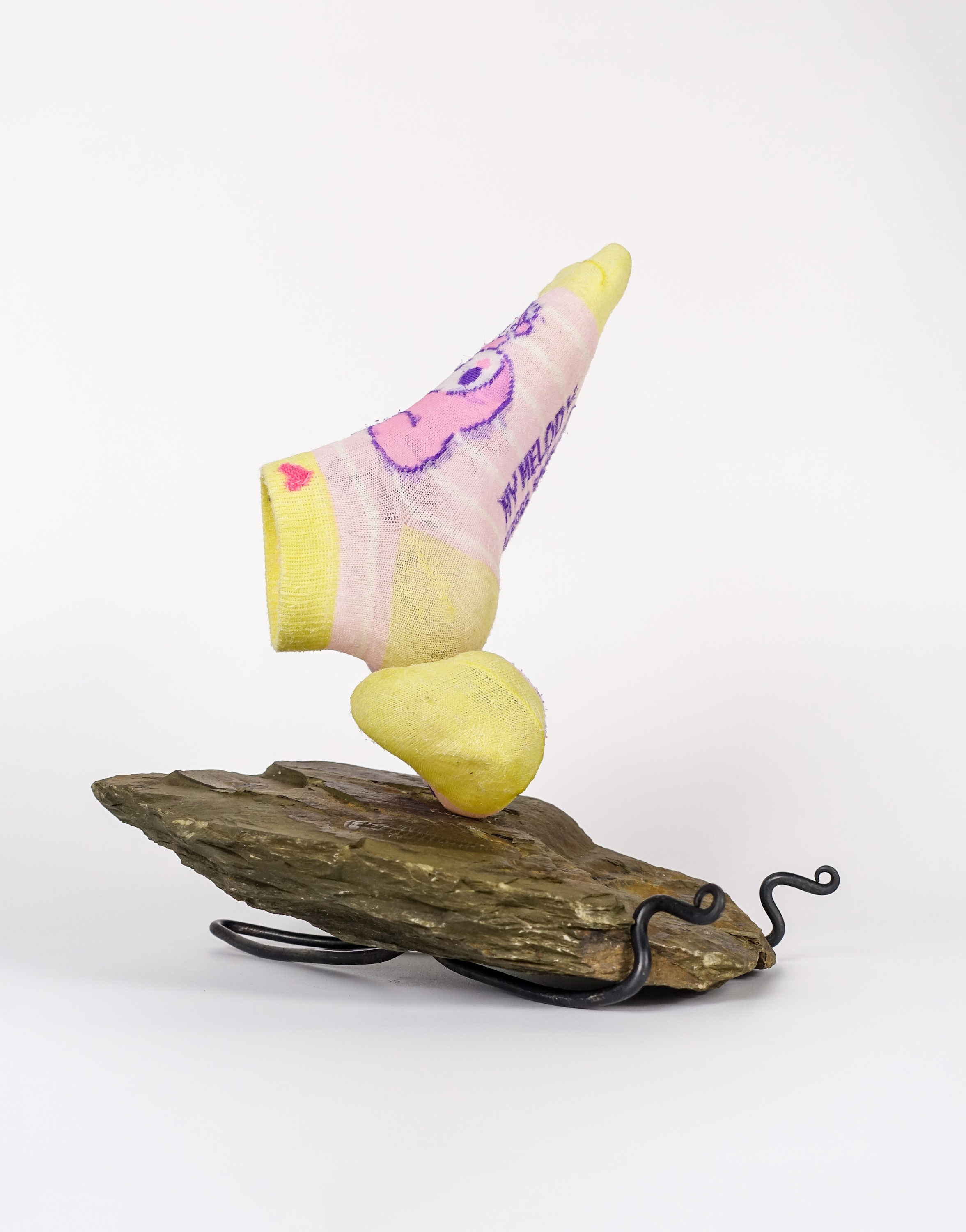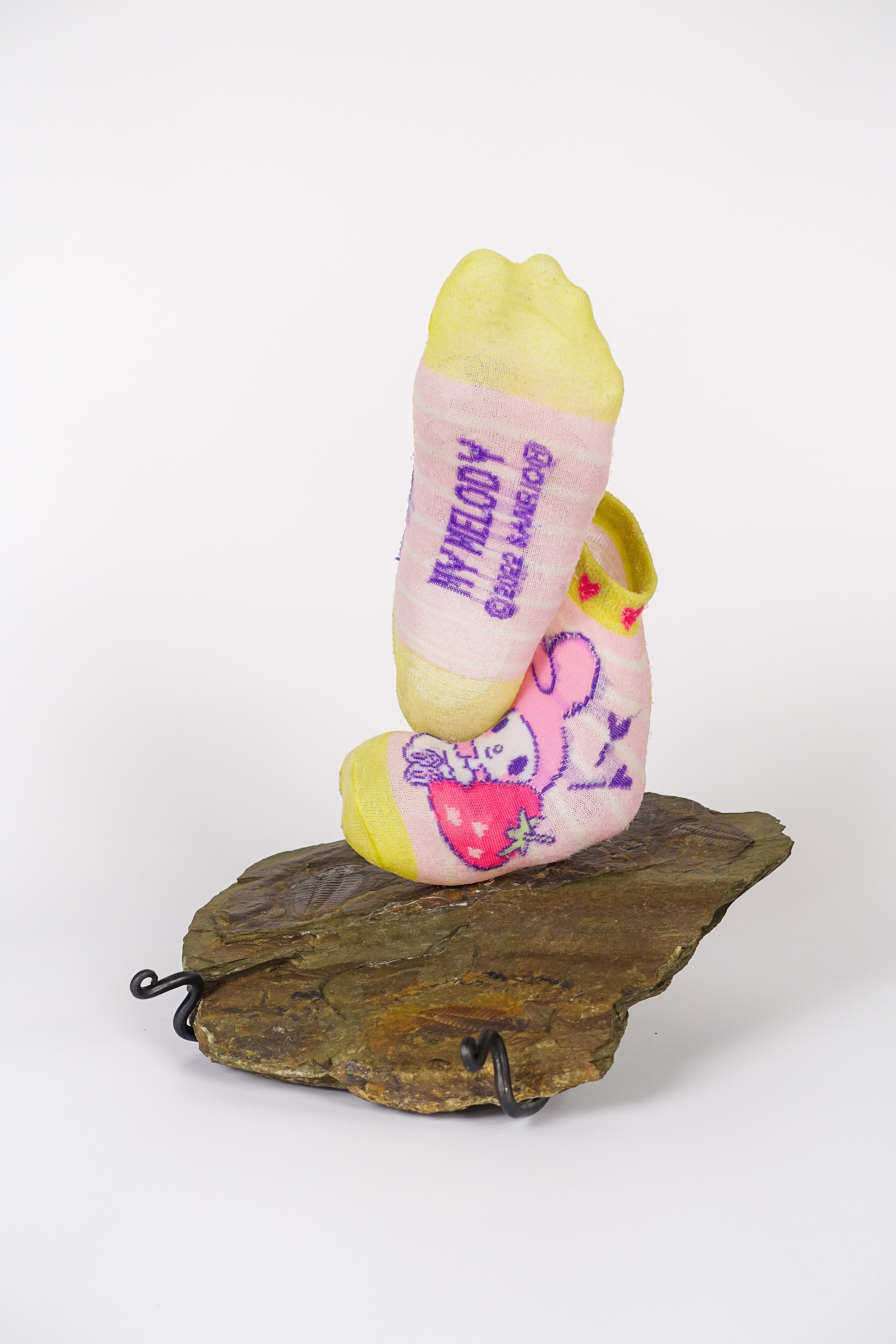 從一位女性賣家於 Twitter 上經營的台灣腳控市集購得的二手棉質襪;三葉蟲化石(紅麗克亞屬,寒武紀早期,約 5 億 1800 萬年前);鋼製支架;以及一部播放賣家在公園中、於樹林鳥鳴與蟲鳴間穿脫襪子影像的螢幕。