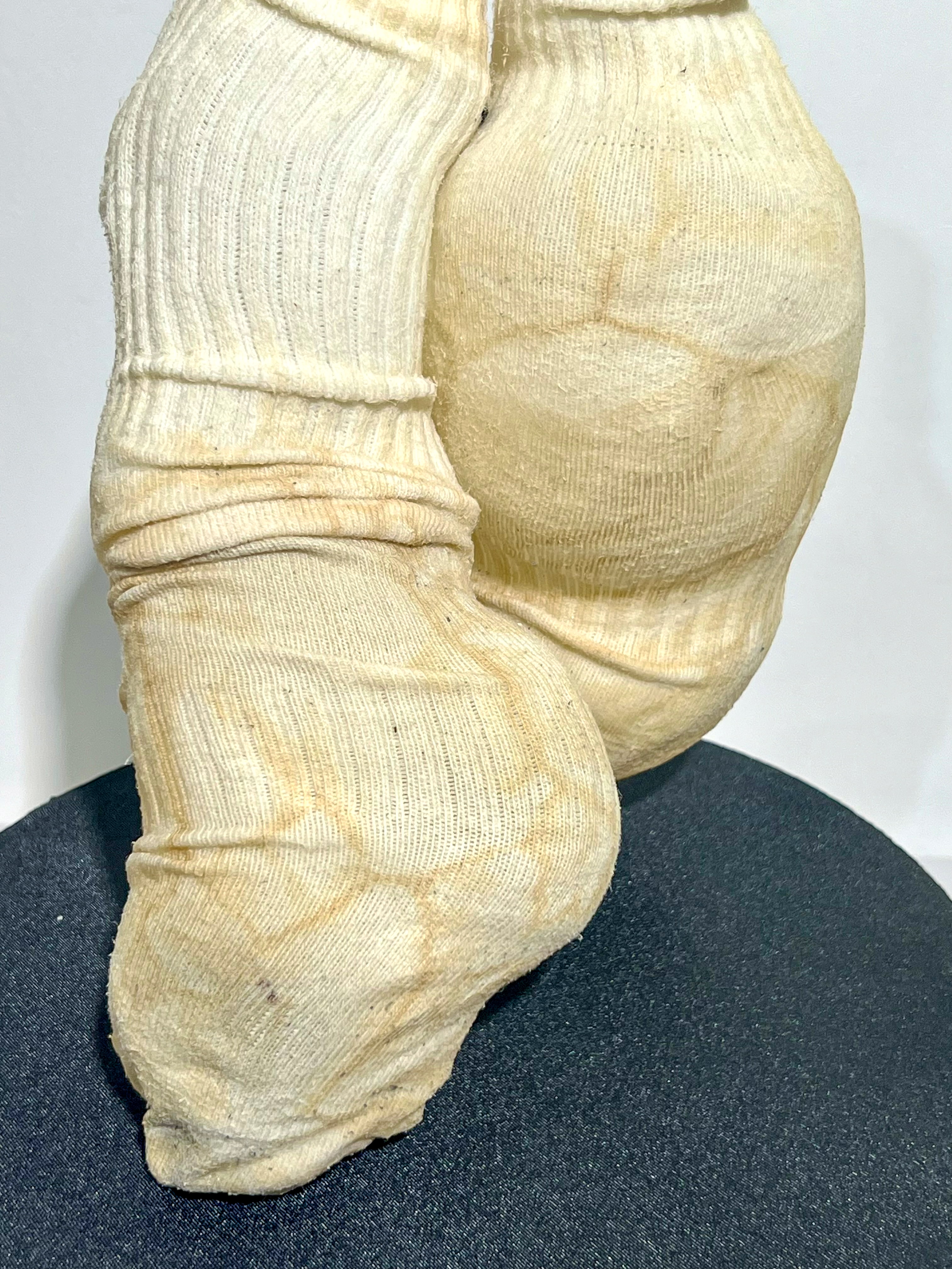 polyester socks purchased from the Taiwanese online foot fetish marketplace on Twitter, spandex and resin over handmade paper on 3D-printed PETG plastic base, monitor, video of the seller wearing and removing the socks.