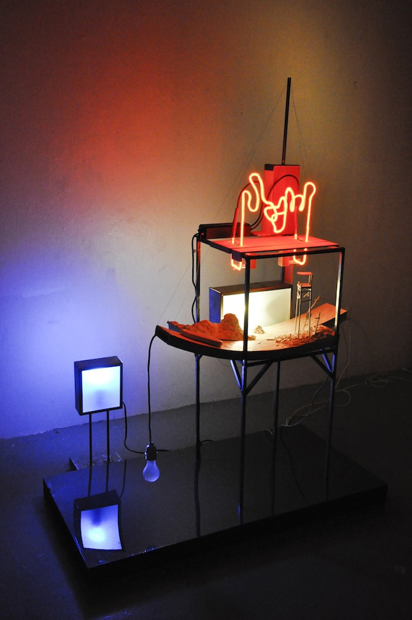 Neon light, wood, metal, lightbulb, plaster, painted acrylic sheet
