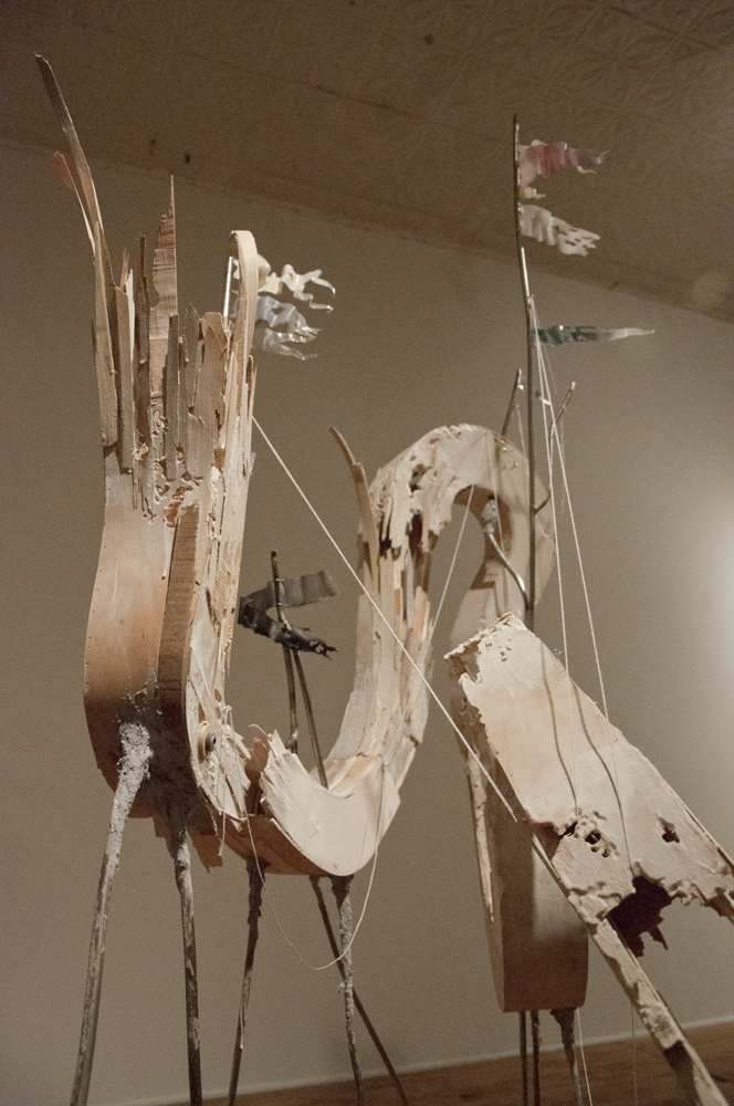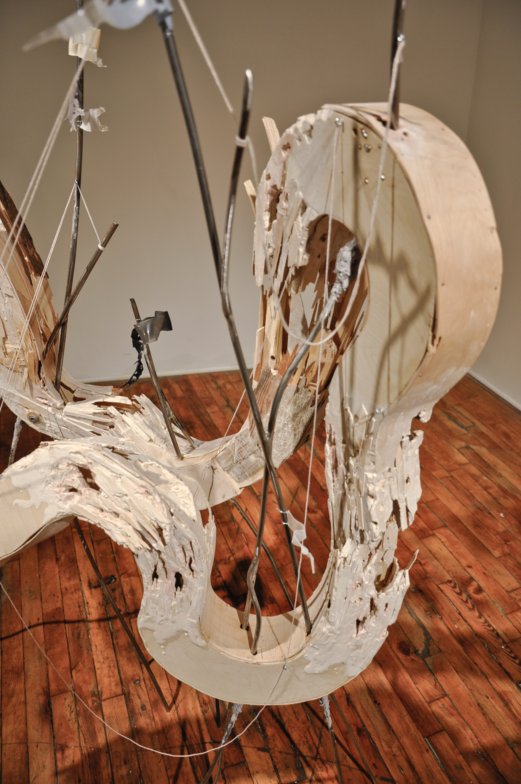 steel, wood, aqua resin, spray painted acrylic, strings, celluclay