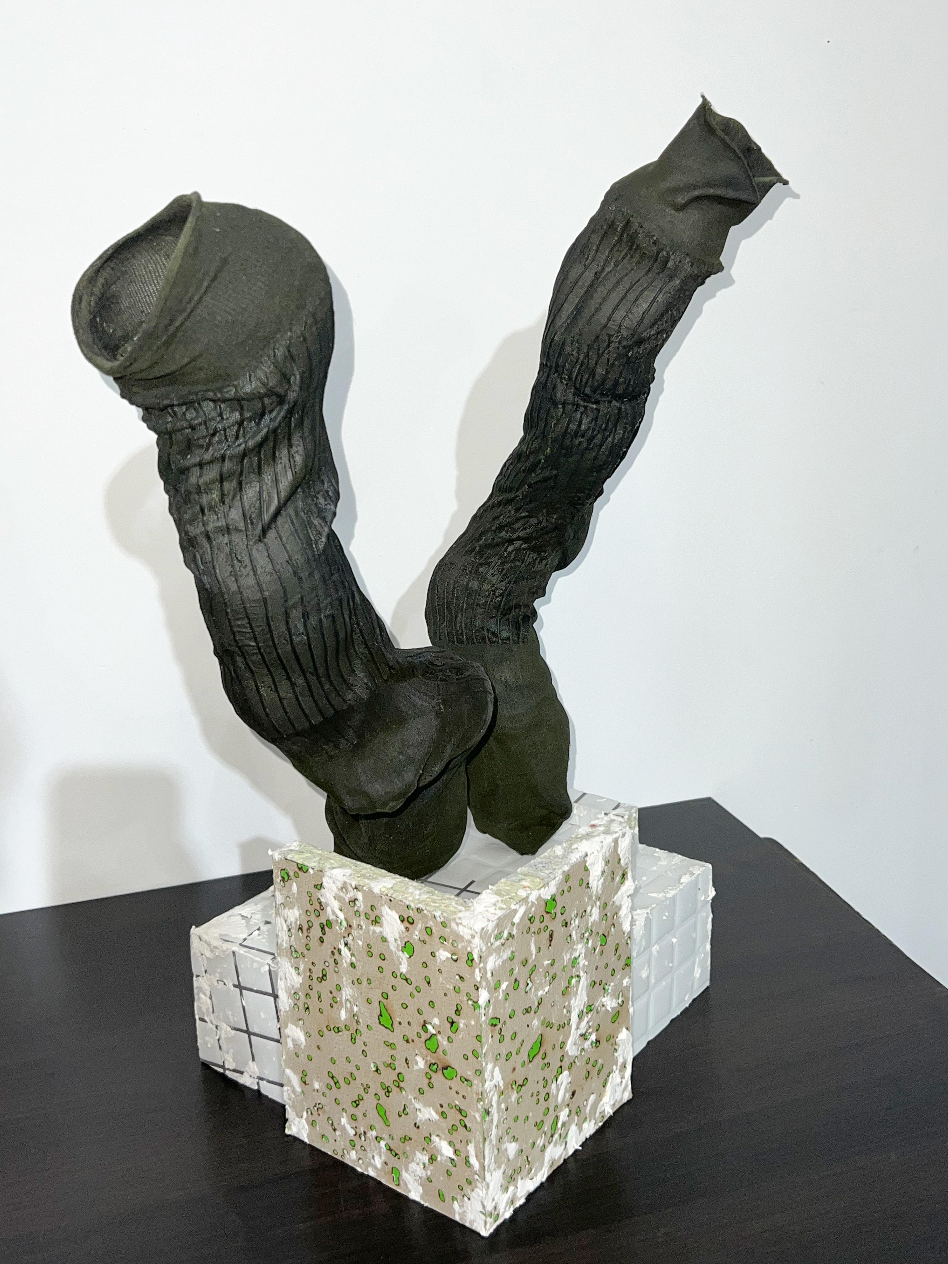 suit socks bought from the Taiwanese foot fetish market place on Twitter , wood, rubber, paper, celluclay, video monitor, video of the seller wearing and removing the socks